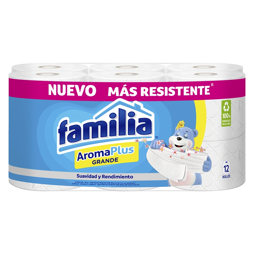...másPapel higiénico Familia con + Aroma, para que entres al baño con un papel que no te falla y te sientas confiado y tranquilo. Es el mejor papel higiénico doble hoja que se adapta a las necesidades de tu familia y a tu presupuesto; entregándote mayor suavidad, rendimiento y dejando un fresco aroma en el baño. Sus dos hojas elaboradas con fibras 100% naturales, te dan la suavidad que te gusta; y su textura con canales absorbentes, te entrega la resistencia que necesitas para que el papel no se desbarate, así usas menos y el rollo te rinde más.